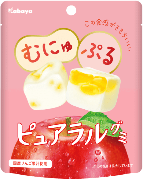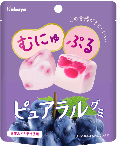 空気を含ませた"むにゅむにゅ食感"グミと、ゼリーのような"ぷるぷる食感"グミ。2つの組み合わせがきもちいい、独特の"むにゅぷる食感"をお楽しみください。
